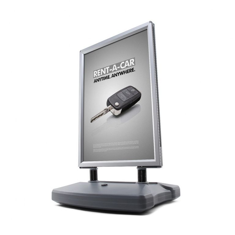 Speziell für Ihre Werbung in windigen Bereichen ist der Kundenstopper WINDTALKER® von Digital Picture Repro & Medienservice in München die optimale Lösung. Sein mit Wasser oder Sand befüllbarer Standfuß bietet in Verbindung mit den Spezialfedern aus Stahl eine hohe Standfestigkeit. Für den einfachen Transport sind im Standfuß Rollen integriert. So können Sie den Kundenstopper trotz des Standgewichtes einfach bewegen. Der Aluminium-Schnellwechselrahmen kann doppelseitig mit Plakaten bestückt werden und garantiert Ihnen auch bei hohen Windstärken eine auffällige Werbemöglichkeit.