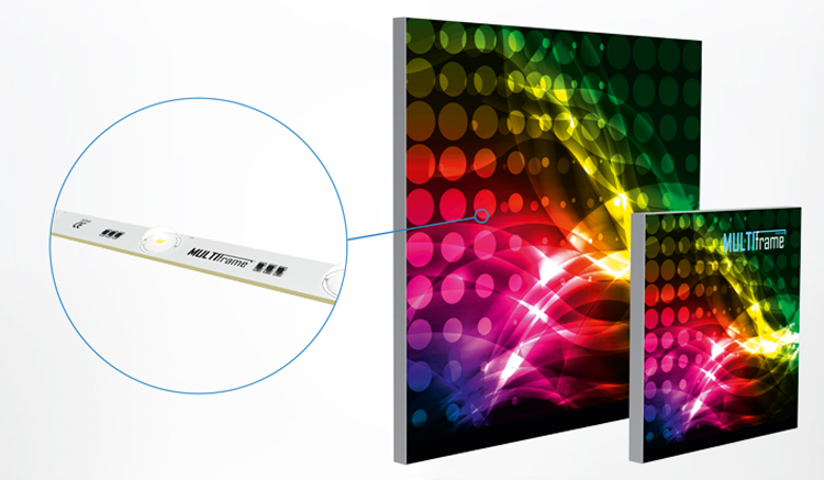Der MULTIframe SUPER SLIM von Digital Picture Repro & Medienservice in München ist ein vollflächig hinterleuchteter LED Rahmen mit einer Bautiefe von nur 35 mm. Das einseitig verwendbare Aluminiumrahmenprofil ist superflach und eignet sich hervorragend für Wandmontagen. Durch die spezielle Linsenform der LED Module kann man trotz der schmalen Bautiefe keinerlei Lichtpunktbildung auf der Stoffoberfläche entdecken – das Motiv wird einheitlich und schattenfrei dargestellt. Die Stoffgrafiken werden mit Gummilippen versehen. Dies ermöglicht einen einfachen und raschen Grafikwechsel. Nicht nur die Leuchtkraft von ca. 7000 lm, sondern auch die homogene Ausleuchtung, machen den MULTIframe SUPER SLIM zu einem Leuchtrahmen, der alle ähnlichen Produkte in den Schatten stellt. Alle Systemteile sind auch als Einzelteile erhältlich.
