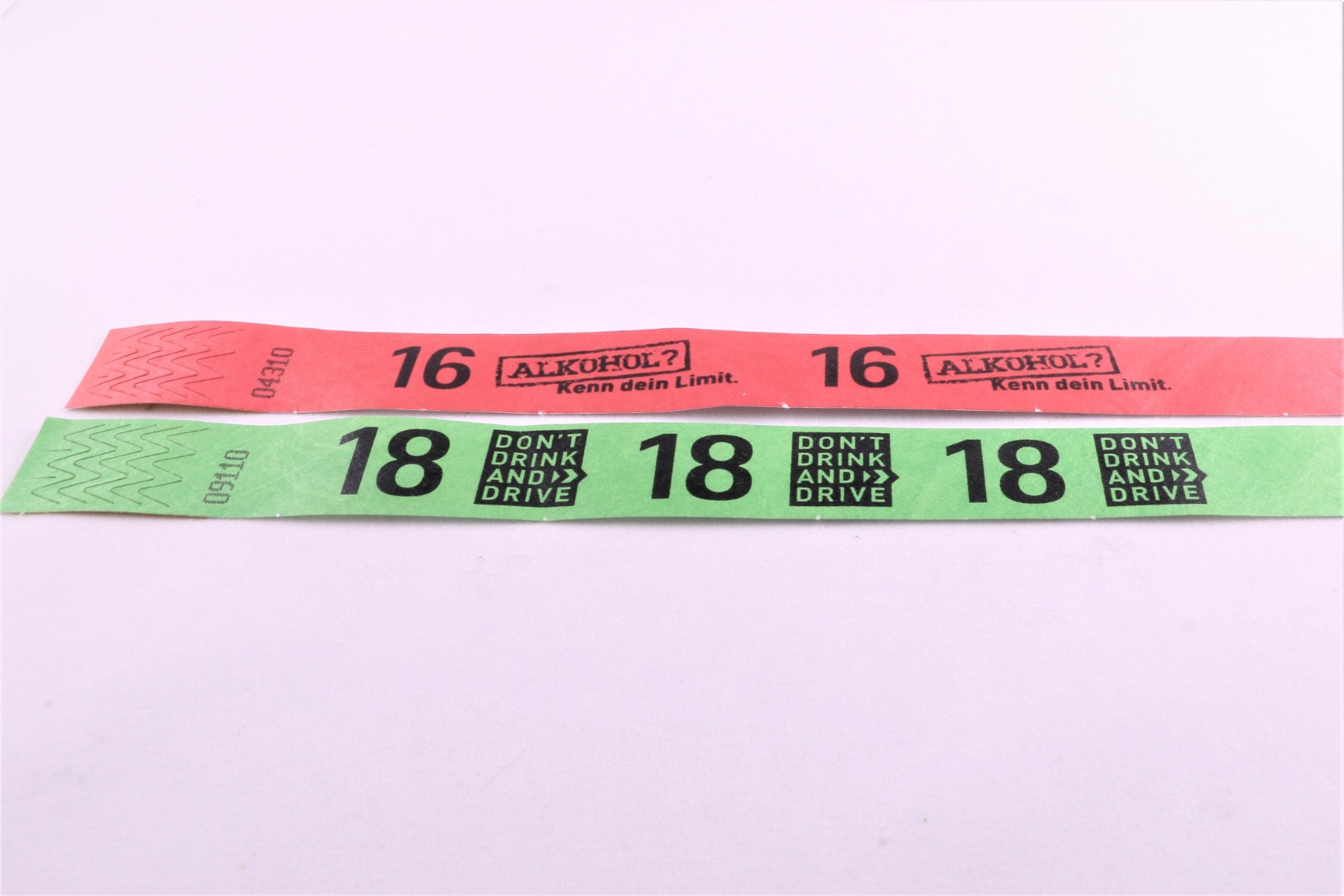 Sie haben die Auswahl aus 8 Motiven, darunter Kinderbänder für die Anwendung bei großen Menschenmassen und Bänder zur Kennzeichnung 16- und 18 jähriger zur sicherstellung des korrekten Alkoholausschanks.